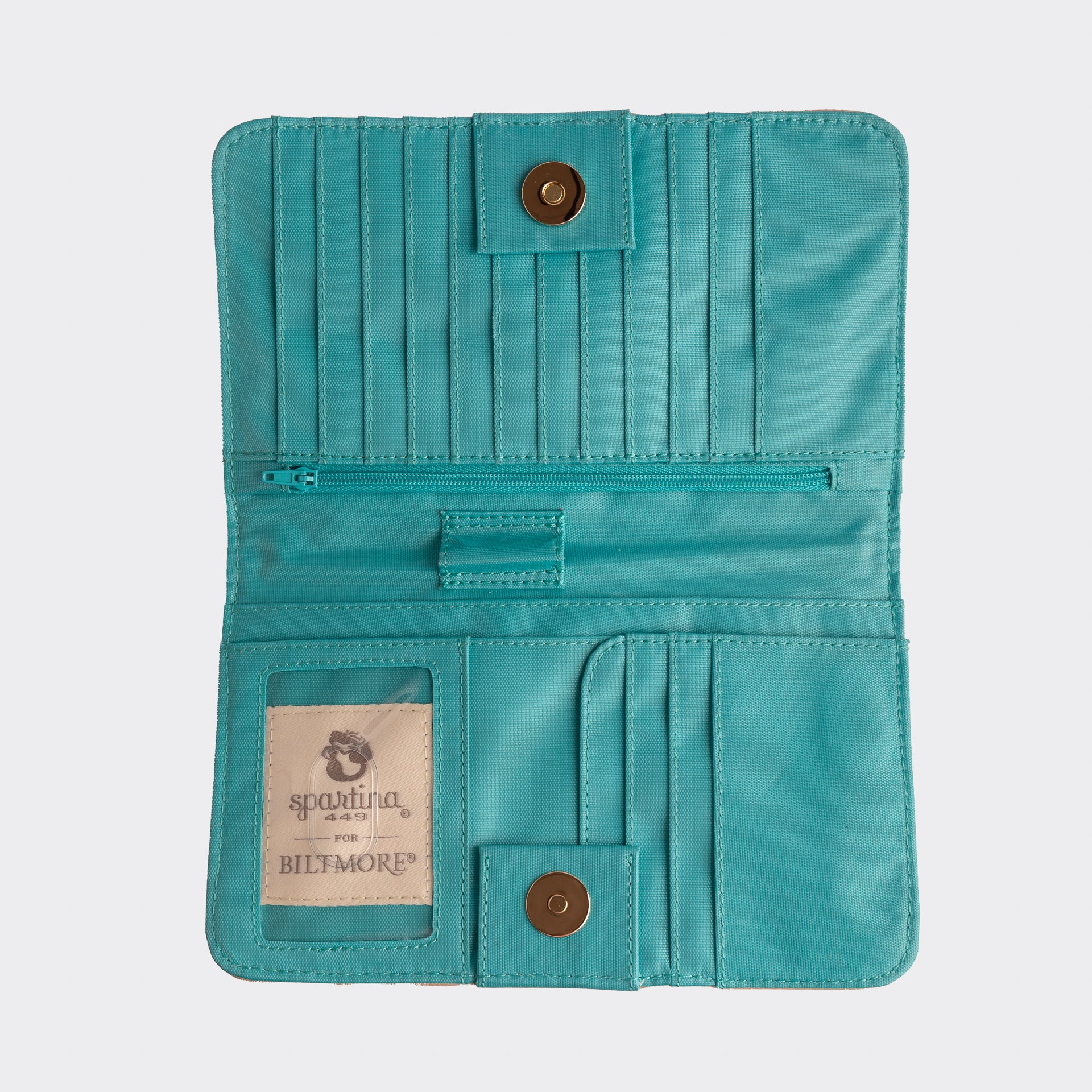 Tuck the Biltmore® Collection Snap Wallet by Spartina into a coordinating bag, and you'll always have a conversation piece showcasing your favorite estate locations and icons. Crafted in Spartina's signature sunny style, this fun and functional wallet is perfectly sized to carry everything you need. With 15 card slots for your convenience, staying organized on the go is a snap! Fits comfortably within the collection tote, sold separately. Biltmore® Collection pattern features estate locations and icons.