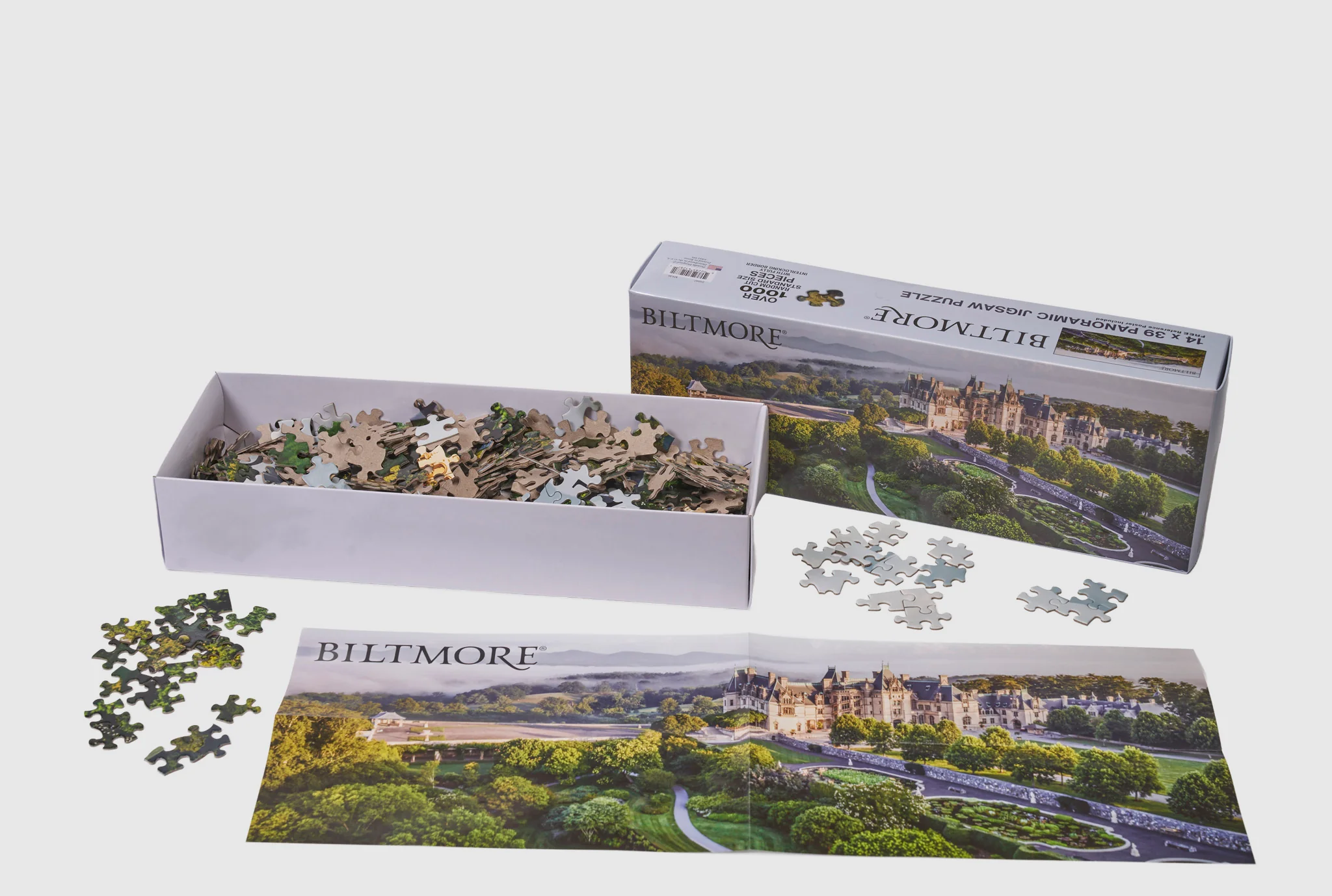 Our panoramic jigsaw puzzleās full-color image includes the estateās Spring Garden and Italian Garden in the foreground, Biltmore House (eastern and southern faƧades), the South Terrace and Tea House to the south, the Stable Courtyard on the houseās north side, and the misty Blue Ridge Mountains in the background. A fantastic gift for puzzle (and Biltmore!) fans of all ages, itās also a lovely reminder of your Biltmore visit you can enjoy assembling again and again.Ā